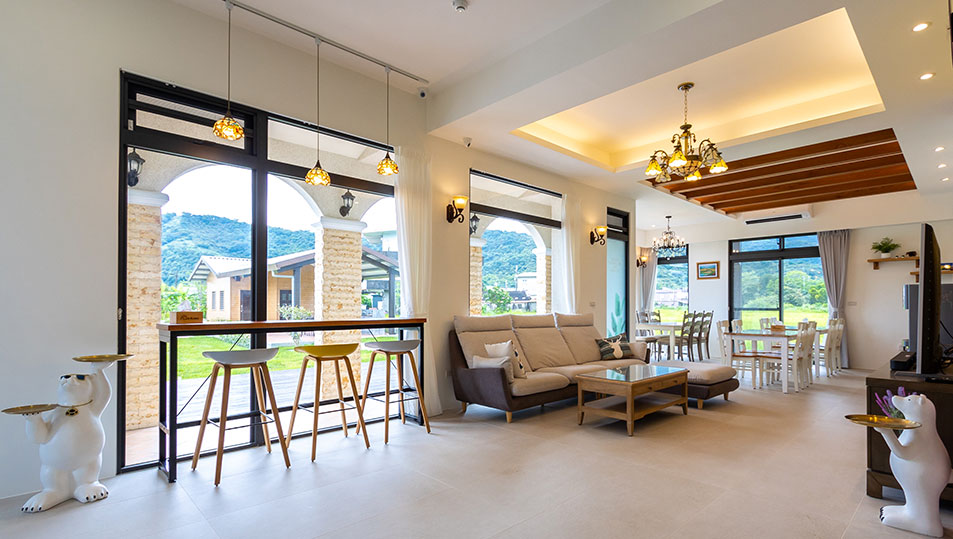 一樓空間挑高明亮,客餐廳有大片的落地窗,可欣賞窗外優美的庭園景觀,讓人享受悠閒放鬆的時光~每間客房都有不同的特色,處處都能感受到主人的用心和熱情,50.嵐 HOUSE歡迎您來體驗田園漫活之旅。